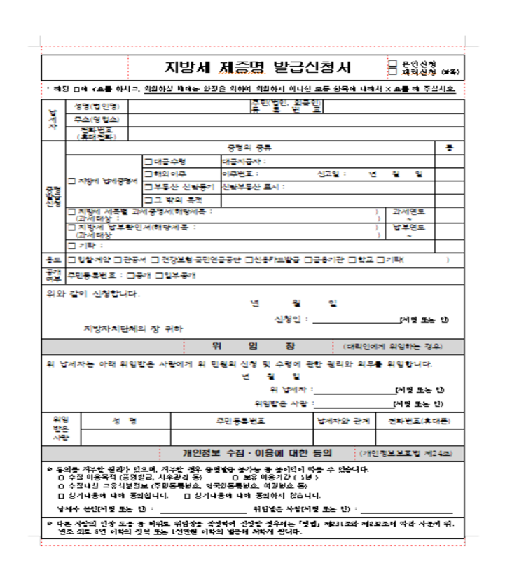 지방세 납세증명서 위임장은 구청, 시청, 주민센터등의 세무과에서 대리발급의 신청시 지방세 납세증명서 신청서식과