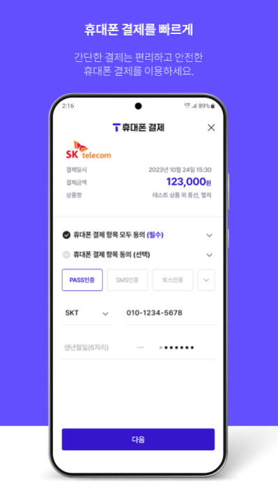 통신사 'PASS앱'을 이용하여 본인인증 및 휴대폰번호 인증을 진행합세요